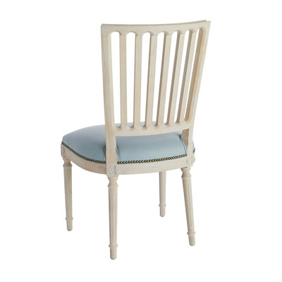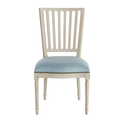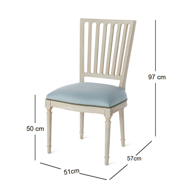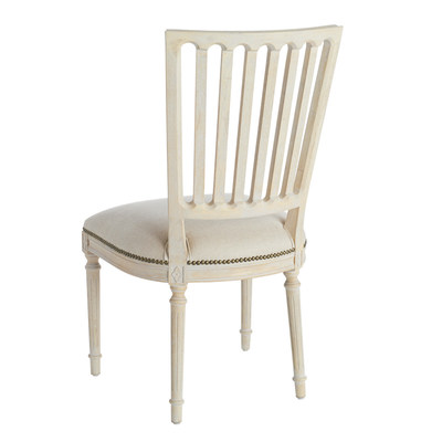 This elegant French-inspired dining chair brings a blend of classic charm and contemporary style. The distinctive lattice back design adds a sophisticated, airy feel to your dining space, while the soft, cushioned seat ensures comfort during long meals. The chair is beautifully finished with a nailhead trim that circles the seat, enhancing its timeless appeal. With a sturdy solid wood frame and no armrests, it offers both style and practicality, making it a perfect addition to any dining room or kitchen with a touch of vintage French flair.