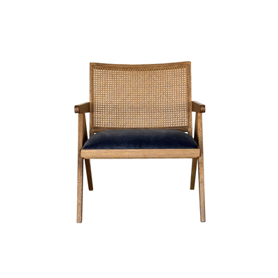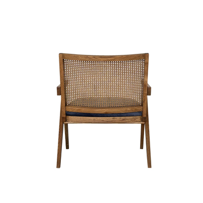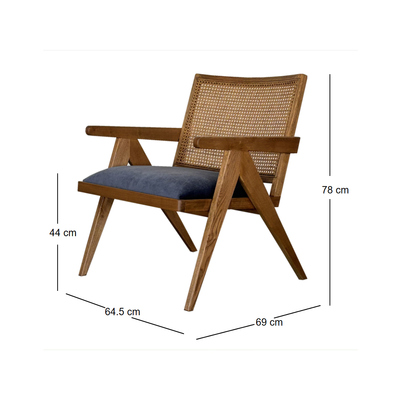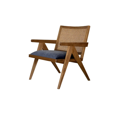 The standout feature of this chair is the handwoven cane backrest, which provides excellent breathability and a touch of artisanal charm. Paired with a generously cushioned seat upholstered in soft, velvet-like fabric in a deep blue tone, the chair offers both comfort and visual contrast. The wide armrests and slightly reclined backrest ensure a relaxed seating experience, perfect for reading, lounging, or entertaining guests.