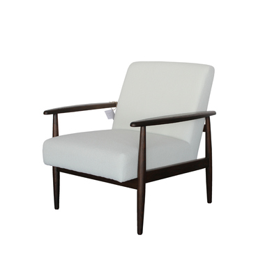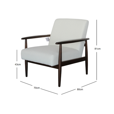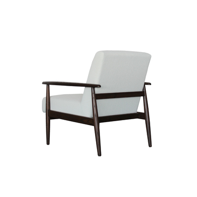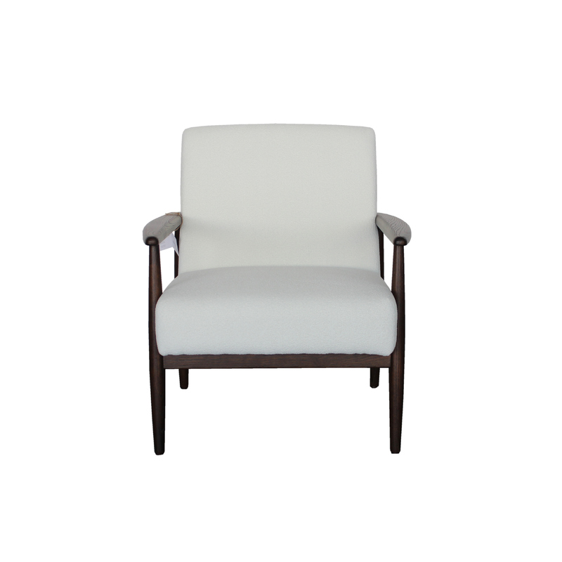 This mid-century inspired lounge chair is a timeless blend of comfort, elegance, and craftsmanship. Built with a solid wood frame in a rich dark finish, the chair showcases slender tapered legs and gently curved armrests that embody the clean lines and organic forms of classic mid-century design. Its sturdy structure ensures long-lasting durability while maintaining a lightweight and refined appearance.