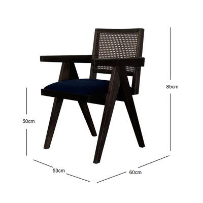 Blending natural textures with refined comfort, this cane back dining chair brings a timeless charm to your dining or living space. The handcrafted woven rattan backrest adds a touch of organic elegance, while ensuring breathability and a light, airy look. Paired with a plush velvet upholstered seat, it offers a sophisticated contrast of textures—smooth, luxurious seating against a warm, rustic backdrop.