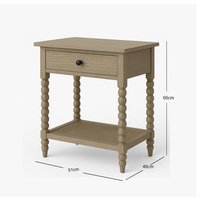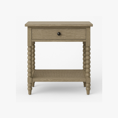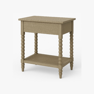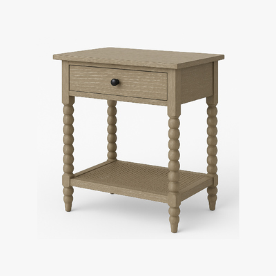 Add a touch of timeless craftsmanship to your home with this solid wood nightstand, designed with distinctive bobbin-turned legs for a classic yet stylish look. The natural wood finish highlights the rich grain patterns, blending seamlessly into farmhouse, rustic, or traditional interiors. A single spacious drawer provides convenient storage for everyday essentials, while the lower woven shelf offers additional space for books, baskets, or decorative accents. Compact and versatile, this wooden nightstand works beautifully as a bedside table, living room accent table, or entryway piece. The combination of its sturdy frame, detailed leg design, and practical storage makes it both functional and decorative. Perfect for those who appreciate quality furniture with character, this bobbin leg nightstand enhances your space with warmth, durability, and understated elegance.