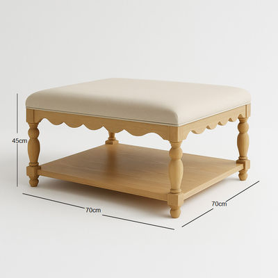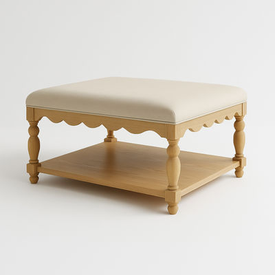 The solid wood frame showcases elegant scalloped apron detailing and turned legs, giving the piece a refined, classic aesthetic that complements French country, farmhouse, cottage, and transitional interiors. A spacious lower wooden shelf adds practical storage—perfect for books, trays, baskets, or décor—making this ottoman both stylish and functional.