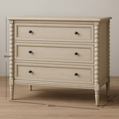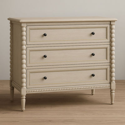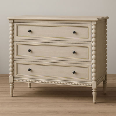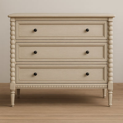 Bring refined craftsmanship and timeless character into your home with this Vintage Beaded Solid Wood 3-Drawer Dresser. Designed with meticulous attention to detail, this dresser features hand-turned beaded side columns and a matching beaded apron that create a charming, heirloom-quality silhouette. Each drawer is framed with elegant panel molding and finished with classic round metal knobs, enhancing the dresser’s understated yet luxurious appeal.