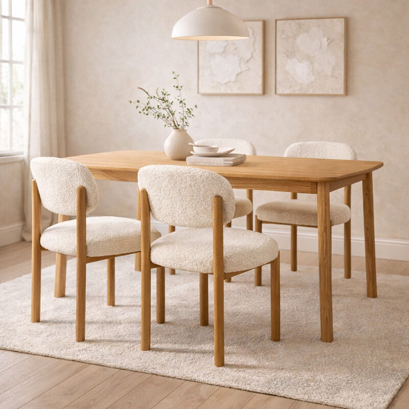 Inspired by Scandinavian minimalism, this dining chair blends clean lines with warm natural textures. The gently rounded backrest and cushioned seat create a soft, inviting silhouette that complements modern, Japandi, and contemporary interiors.