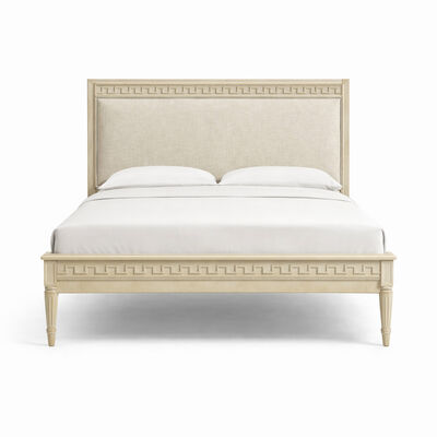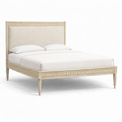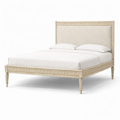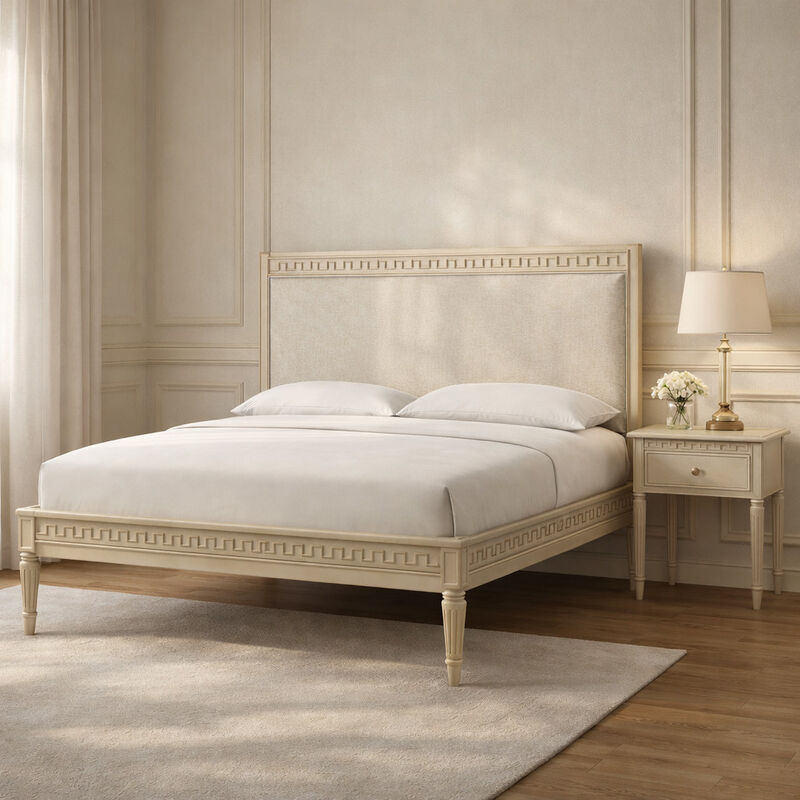 The Aurelian Carved Solid Wood Upholstered Bed brings refined elegance and timeless craftsmanship into the bedroom. Inspired by classic French design, this bed features a solid wood frame accented with intricate geometric carvings that define the signature aesthetic of the Aurelian Collection.