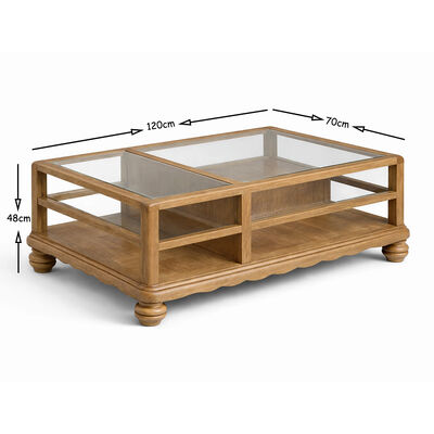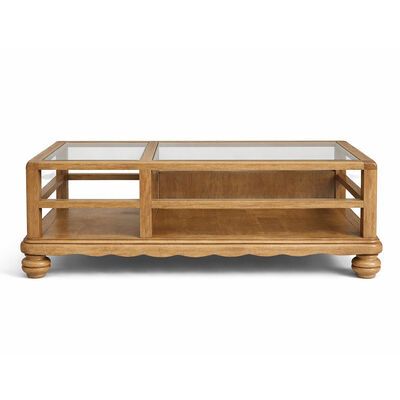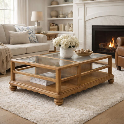 This solid wood and glass storage coffee table is designed to bring warmth, functionality, and timeless style to your living room. Crafted from durable solid wood with a natural finish, this coffee table features a clear glass top that creates an open, airy look while showcasing the beautifully structured interior below.